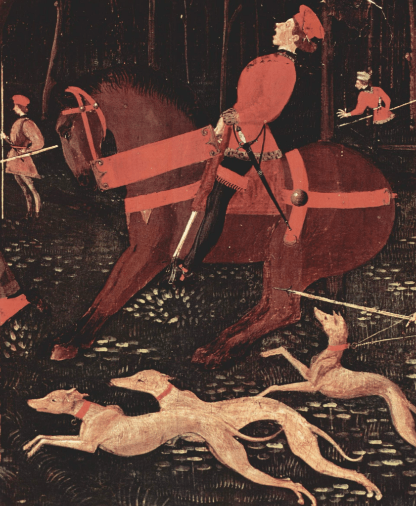 A Paolo Uccello no se le ocurre otra cosa para contarnos una caza que situarla en ese espacio misterioso, que algunos llamarían onírico, y que en todo caso es sobrecogedor. Esos oscuros de Uccello en suelo y cielo me han parecido, desde que me los mostró en el colegio mi profesora Lola, la de Historia del Arte, la más perfecta plasmación del mundo en el que entonces y hoy se desarrollan mis pesadillas. Muchos finos analistas compiten por mostrar que «no hay tanta expresión» genuina en Uccello, porque esas oscuridades están justificadas por circunstancias verosímiles: humus sin cultivar, colinas de pizarra, umbrías durante el ocaso. Me parece que hay muchos oscuros de esos que no podrían explicarse así. En esta caza, además, podemos pensar que el escenario es tan estilizado como estilizados son los seres vivos que en él aparecen. No son meros retratos, ni mucho menos retratos «fotográficos»: recuerdan al futuro, a manierismos incluso del siglo XX, a ilustraciones